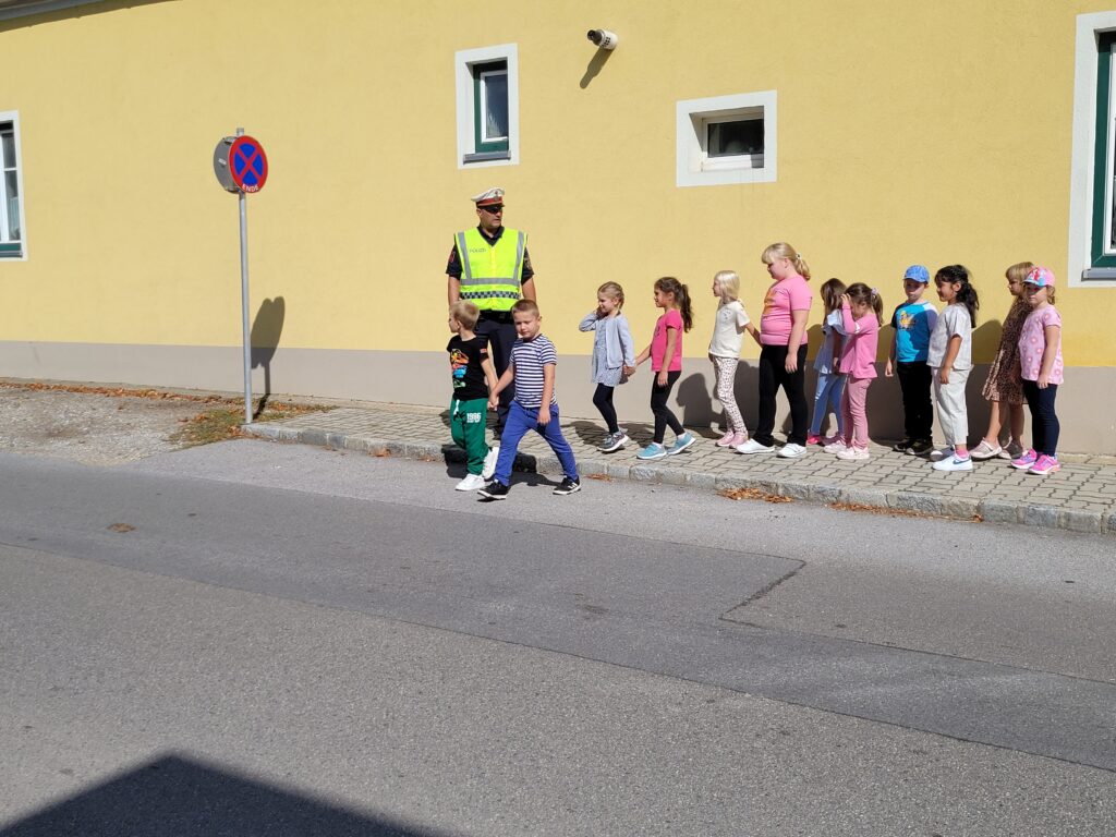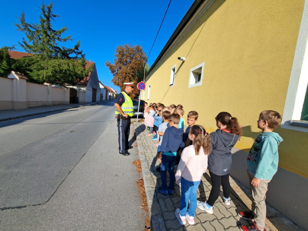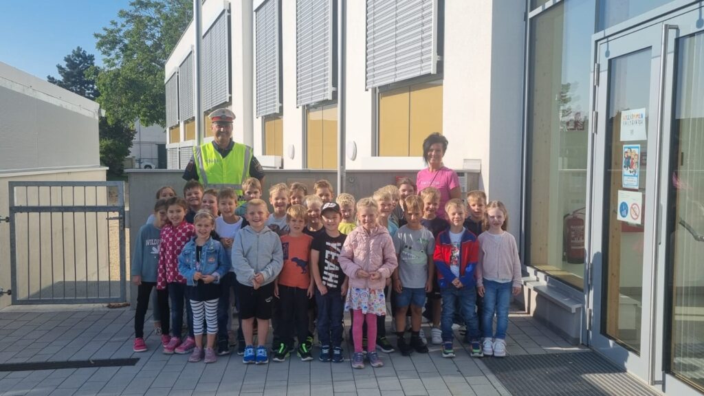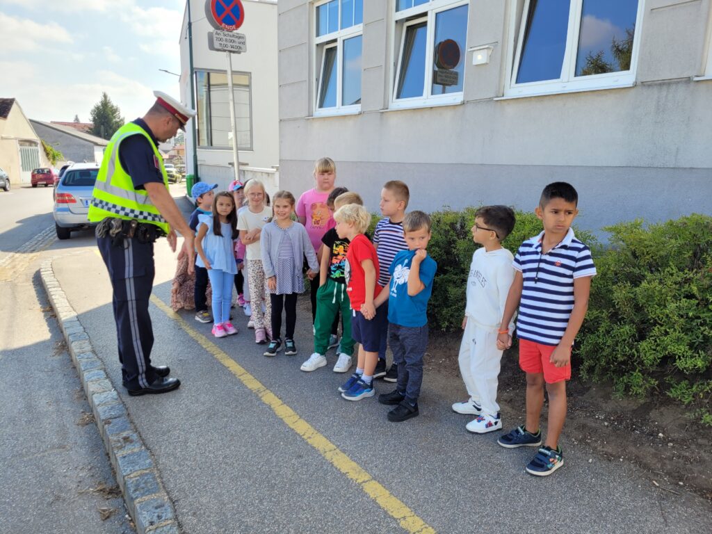 Herr Leitner besuchte die 1. Klassen und zeigte den Kindern wie sie sicher und richtig eine Straße auf einem Zebrastreifen überqueren. Die Kinder lernten dabei auch, wie sie eine Straße ohne Ampel und Zebrastreifen überqueren können.