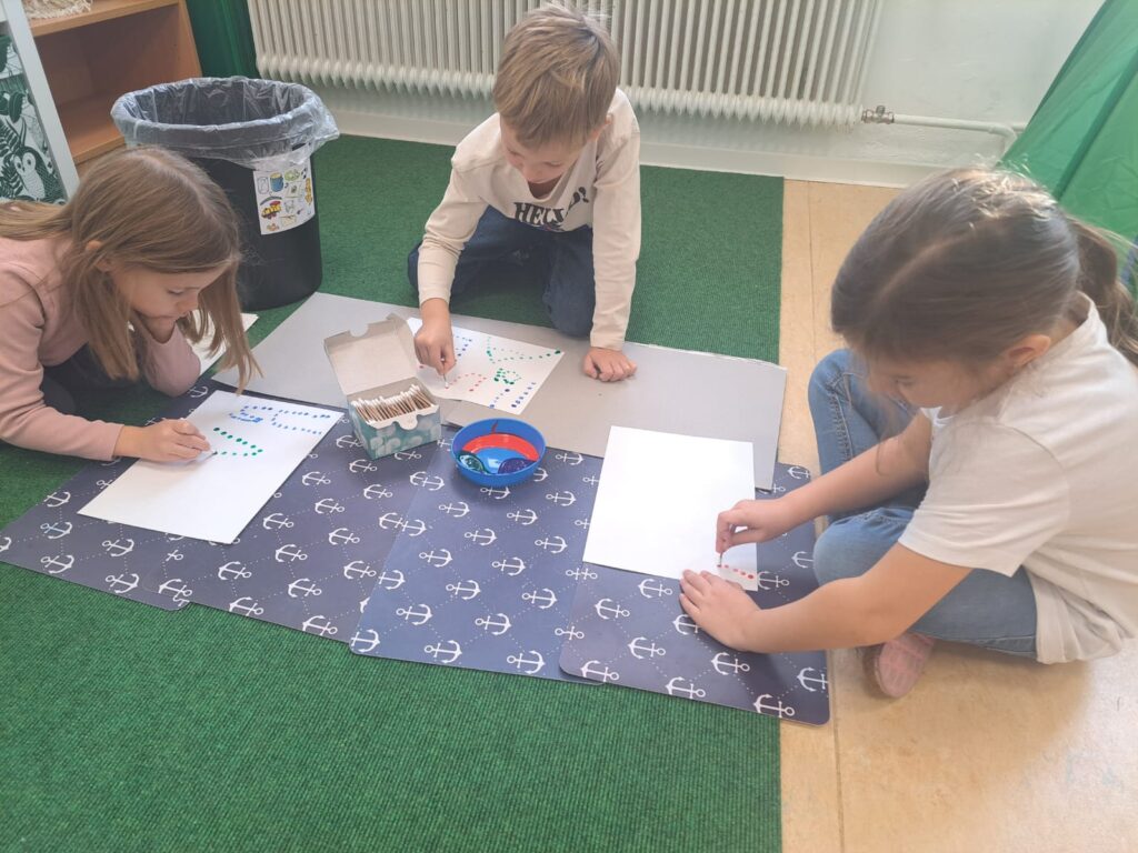 Dieser Tag ist sehr abwechslungsreich: Wir basteln, schreiben auf der White- Board oder auch im Sand, wir hören, wir balancieren und wir turnen!