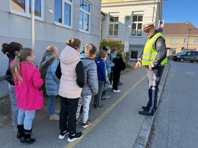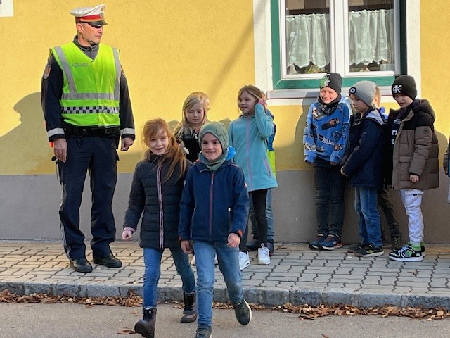 Herr Leitner besuchte die 1. Klassen und zeigte den Kindern wie sie sicher und richtig eine Straße auf einem Zebrastreifen überqueren. Die Kinder lernten dabei auch, wie sie eine Straße ohne Ampel und Zebrastreifen überqueren können.