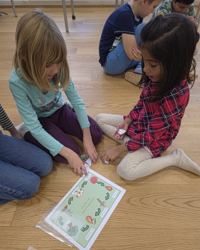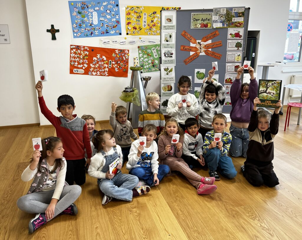 Die Kinder haben gelernt, wie aus einem kleinen Apfelkern ein Baum wächst, der später Äpfel trägt. Dazu konnten verschiedene Arbeitsblätter und Lernspiele in der Gruppe bearbeitet werden.