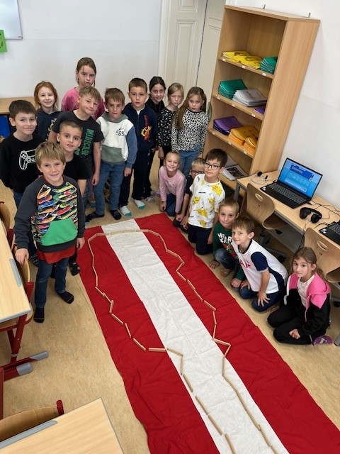 Die Kinder beschäftigen sich in vielfältiger Weise mit dem Thema Österreich: sie lernen Sprüche, Gedichte und Lieder, sie basteln Fahnen, Ketten und Hüte in Rot-Weiß-Rot, sie sprechen über wichtige Orte, Symbole und Werte unseres Landes.