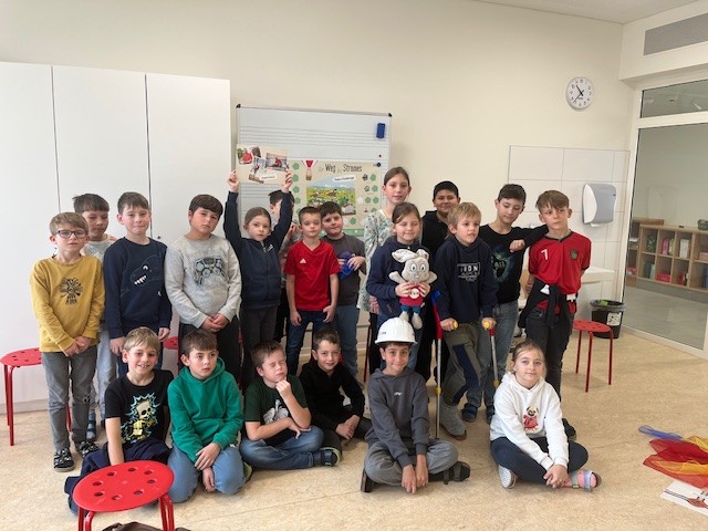 Unter dem Motto „Wir kennen uns aus“ wurden in den drei 2. Klassen noch einmal vor Ort und und rund um das Schulhaus die wichtigsten Verkehrsflächen besprochen sowie das richtige Überqueren der Straße geübt!