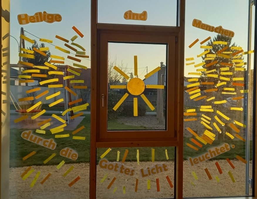 Unter dem Motto „Heilige sind Menschen, durch die Gottes Licht leuchtet“ haben wir über Allerheiligen nachgedacht. Alle Kinder durften einen „Lichtstrahl“ mit ihrem Namen beschriften und an das Fenster kleben, als Zeichen dafür, dass auch durch UNS Gottes Licht und Liebe strahlen kann.