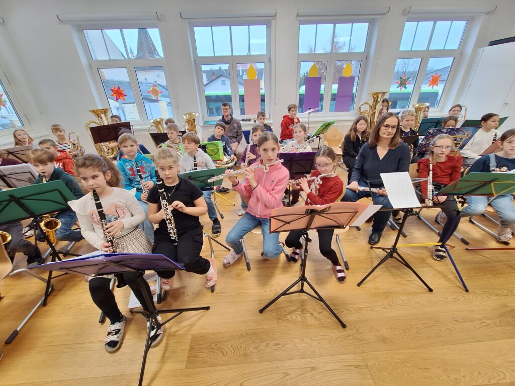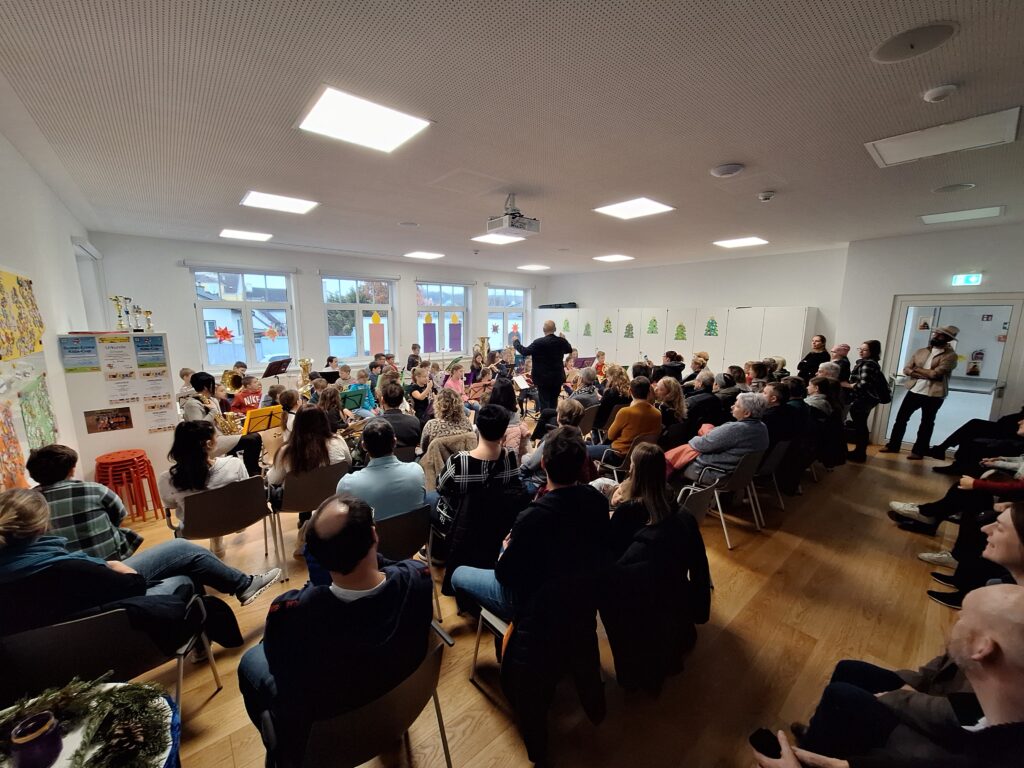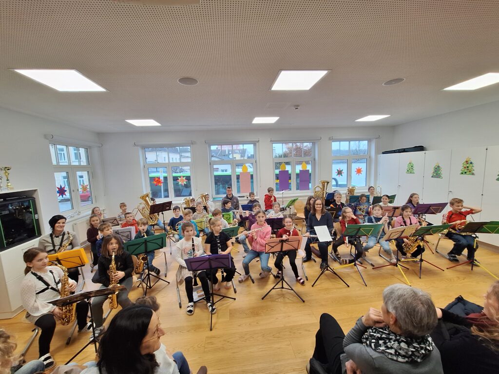 Unter der Leitung des Musikschullehrers Andreas Schacher präsentierten 24 Kinder der Bläserklasse 3 sowie 12 Kinder der Bläserklasse 4 Ihr Können.