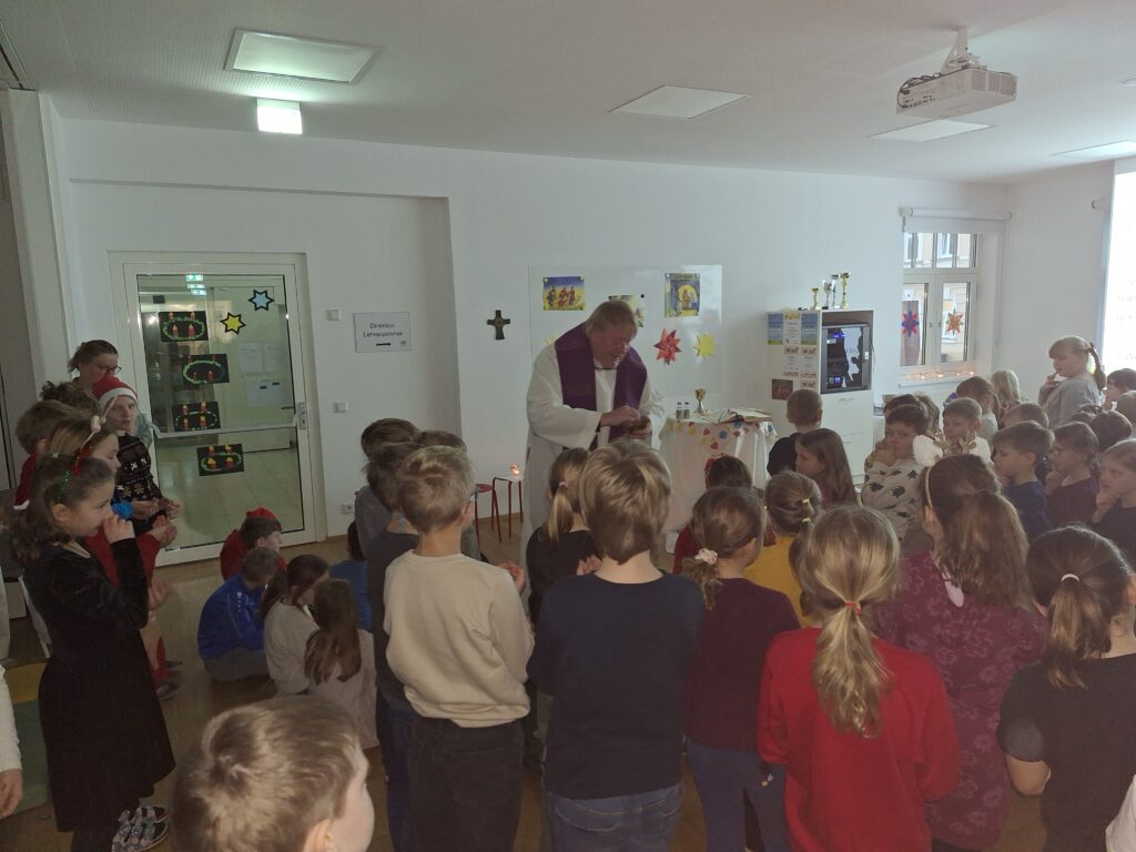 Dazu brachte jede Klasse ihren Adventkranz in die Aula, um diesen von unserem Stadtpfarrer Kolo segnen zu lassen.